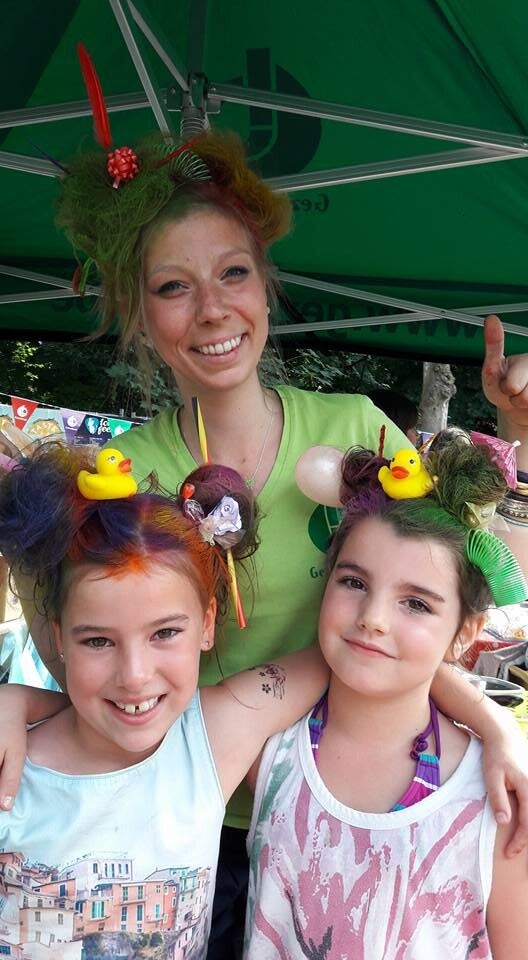 Met mijn sleurhutje tour ik vrolijk rond, als een klein rondreizend atelier op wielen en waar ik stop, strooi ik een beetje magie rond: glitter, vlechtjes, kleur en stralende gezichtjes.