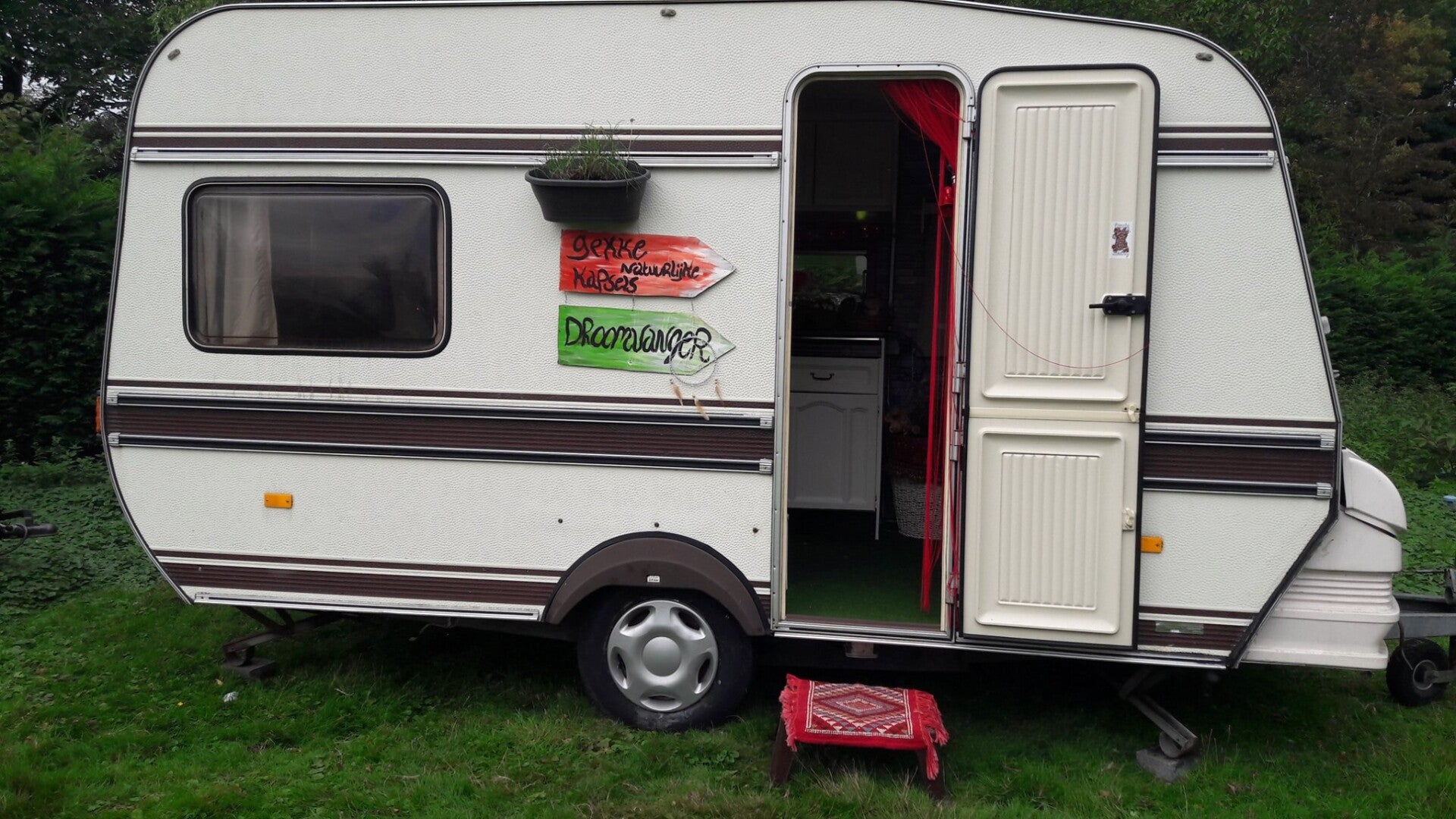 Een oude witte caravan, die ik samen met mijn mama en vrienden helemaal omtoverde tot mijn eigen kleine droomplek. Stap voor stap richtten we haar in, met liefde, plezier en een flinke portie fantasie, zodat ik mezelf op een unieke manier kon voorstellen op evenementen.